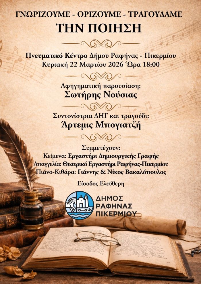 Ο Δήμος Ραφήνας-Πικερμίου, μέσω του Τμήματος Πολιτισμού, σας προσκαλεί σε μια ξεχωριστή εκδήλωση αφιερωμένη στην Ποίηση,