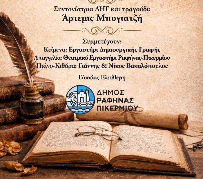 Η εκδήλωση πραγματοποιείται με τη συνεργασία των Εργαστηρίων Δημιουργικής Γραφής και του Θεατρικού Εργαστηρίου Ραφήνας-Πικερμίου.