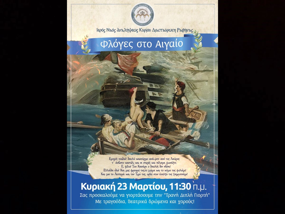 Την Κυριακή 23 Μαρτίου 2025, μετά τη Θεία Λειτουργία, σας προσκαλούμε στον Ιερό Ναό Ανάληψης στη διασταύρωση Ραφήνας, για να τιμήσουμε την διπλή Εθνική Εορτή με μια μοναδική εκδήλωση.