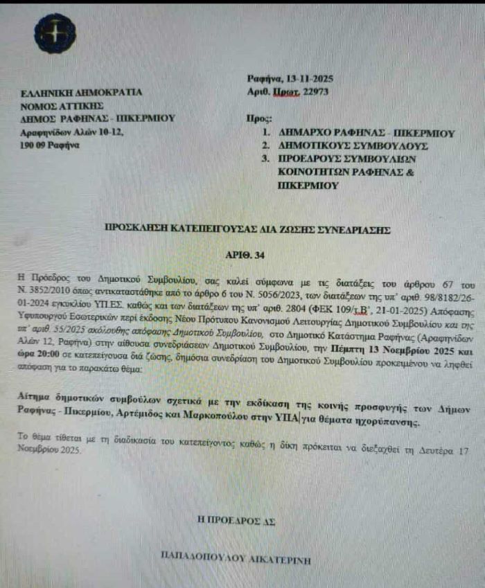 Συγκαλείται σήμερα εκτάκτως το Δημοτικό Συμβούλιο Ραφήνας Πικερμίου προκειμένου να αποφασίσει για την εκδίκαση της κοινής προσφυγής των δήμων Ραφήνας Πικερμίου, Σπάτων Αρτέμιδας και Μαρκοπούλου στην ΥΠΑ. Στις 8 το βράδυ. κατόπιν πρωτοβουλίας του Παύλου Μπατάλη και την σύμφωνη γνώμη 10 συμβούλων.