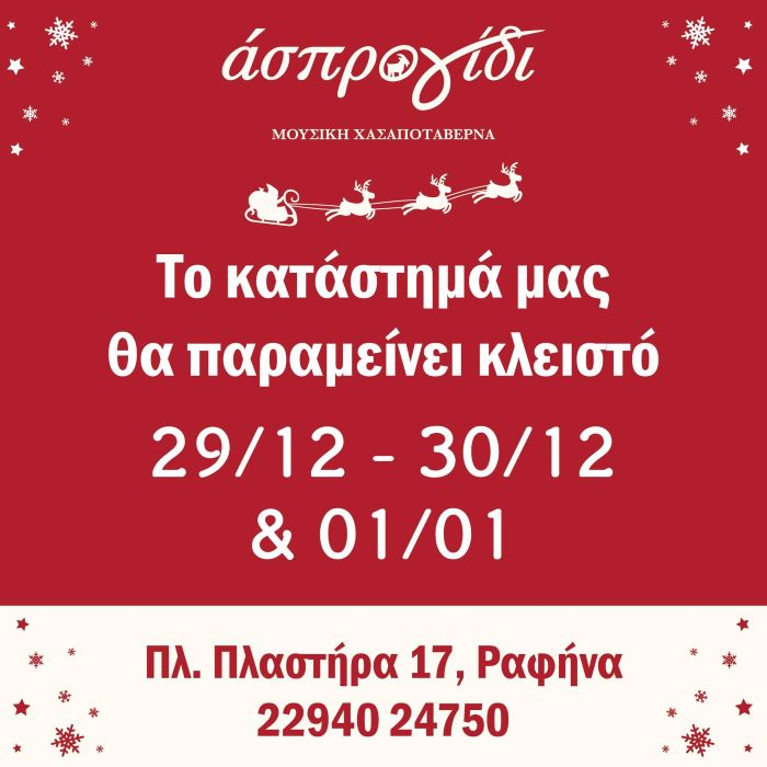 Μια μικρή… παύση θα κάνει η αγαπημένη μουσική χασαποταβέρνα «Άσπρο Γίδι» στην κεντρική πλατεία της Ραφήνας, καθώς θα παραμείνει κλειστή στις 29 και 30 Δεκεμβρίου καθώς και την Πρωτοχρονιά, 1 Ιανουαρίου.