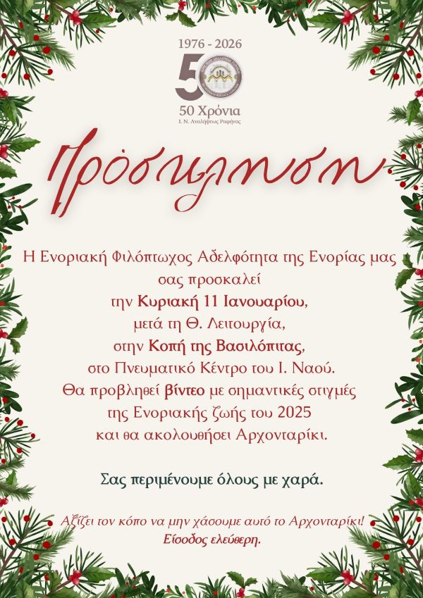 Η εκδήλωση δεν θα είναι μια τυπική συνάντηση. Θα προβληθεί βίντεο με σημαντικές στιγμές της ενοριακής ζωής του 2025, ένα μικρό αλλά ουσιαστικό χρονικό πίστης, προσφοράς και κοινότητας. Στη συνέχεια θα ακολουθήσει Αρχονταρίκι, όπως παλιά: ανθρώπινο, ζεστό, χωρίς βιασύνη και χωρίς φίλτρα.
