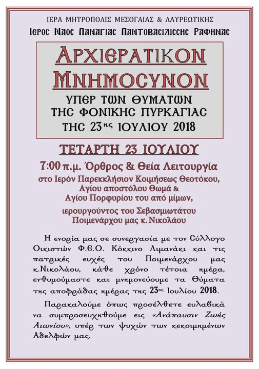 Την Τετάρτη 23 Ιουλίου 2025, με αφορμή τη συμπλήρωση επτά ετών από τη φονική πυρκαγιά της 23ης Ιουλίου 2018, θα τελεστεί Αρχιερατικό Μνημόσυνο στο Κόκκινο Λιμανάκι Ραφήνας, υπέρ αναπαύσεως των ψυχών των θυμάτων της ανείπωτης αυτής τραγωδίας.
