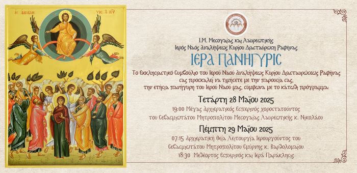 Ραφήνα: Ο Ιερός Ναός της Ανάληψης γιορτάζει 28 και 29 Μαϊου χοροστατούντος του Μητροπολίτη μας κ.κ. Νικολάου (πρόγραμμα) – rpn