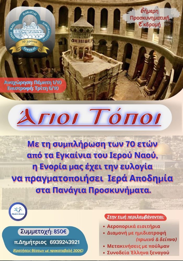 Ο Καθεδρικός Ιερός Ναός Παναγίας Παντοβασίλισσας ανακοινώνει την πραγματοποίηση Ιεράς Αποδημίας στους Αγίους Τόπους, από 1 έως 6 Οκτωβρίου 2026. Μια προσκυνηματική πορεία που δεν είναι «εκδρομή με ωραίες φωτογραφίες», αλλά βίωμα. Από εκείνα που σε ταρακουνούν λίγο — με την καλή έννοια.