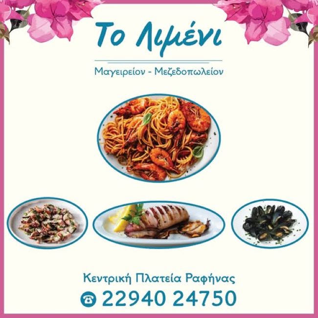 Στην καρδιά της Ραφήνας, στην κεντρική πλατεία, το εστιατόριο «Το Λιμένι» σας προσκαλεί να απολαύσετε εκλεκτά πιάτα με τα πιο φρέσκα θαλασσινά. Το μενού περιλαμβάνει ποικιλία γεύσεων που ικανοποιούν και τους πιο απαιτητικούς ουρανίσκους, ενώ προσφέρονται ειδικές επιλογές για όσους νηστεύουν.