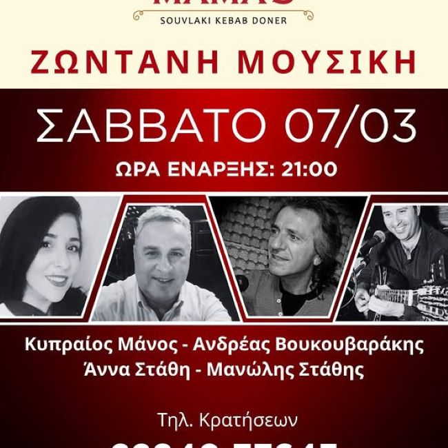 Το Mamas Souvlaki Doner Kebab σας περιμένει το Σάββατο 7 Μαρτίου για μια βραδιά με γεύσεις και ζωντανή μουσική.