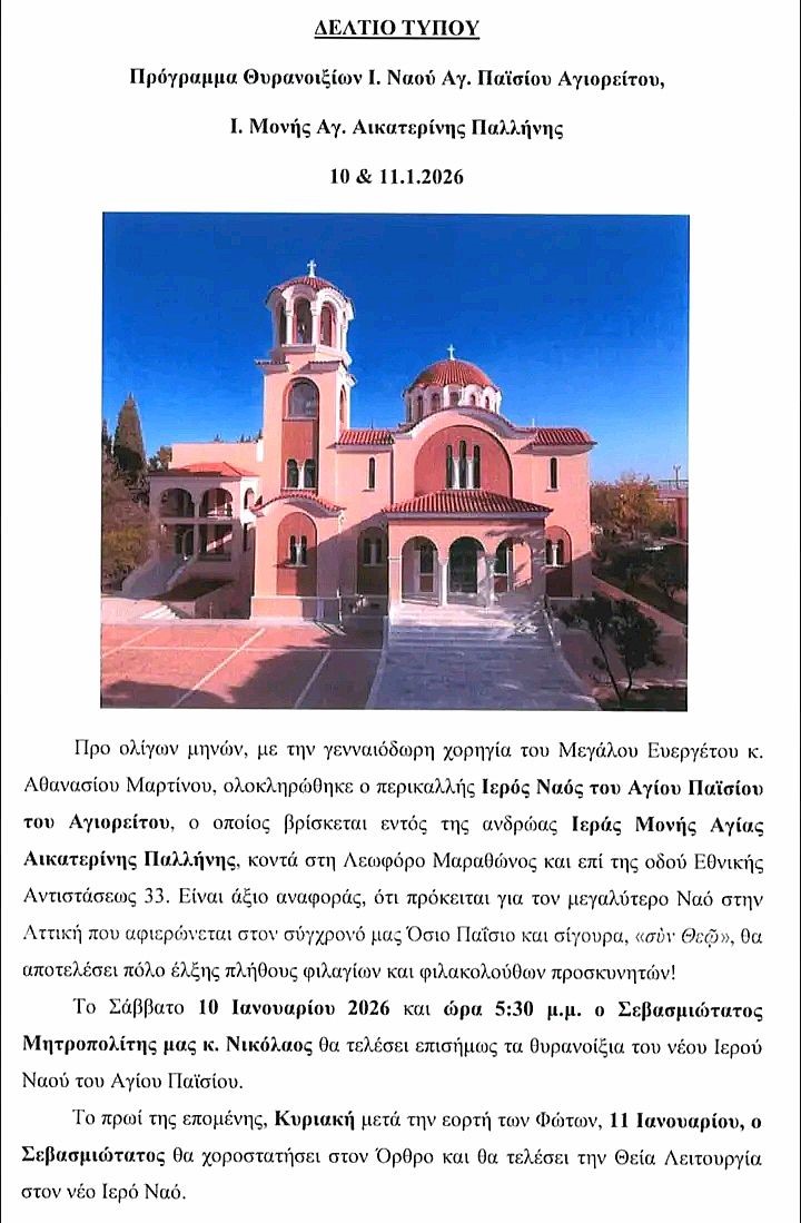 Σε κλίμα βαθιάς συγκίνησης και πνευματικής χαράς τελέστηκαν το Σάββατο 10 Ιανουαρίου 2026, το απόγευμα, τα επίσημα Θυρανοίξια του νέου Ιερού Ναού του Αγίου Παϊσίου του Αγιορείτου, στην Παλλήνη. Πρόκειται για τον μεγαλύτερο Ναό αφιερωμένο στον Άγιο Παΐσιο στην Αττική, ο οποίος δεσπόζει εντός της Ιεράς Μονής Αγίας Αικατερίνης.