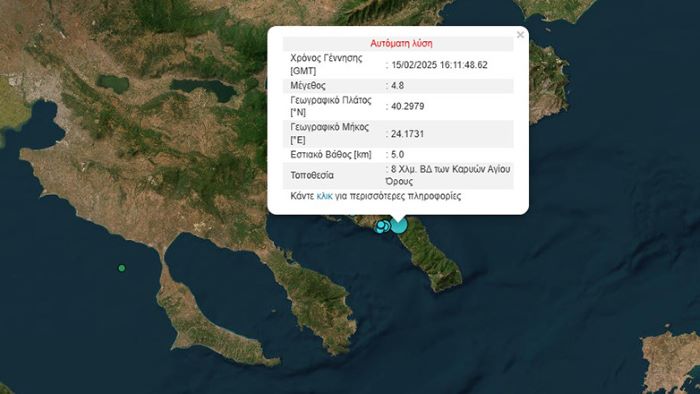 Σεισμική δόνηση μεγέθους 4,8 βαθμών της κλίμακας Ρίχτερ σημειώθηκε στις 18:11 το απόγευμα του Σαββάτου (15/2) στο Άγιο Όρος.
