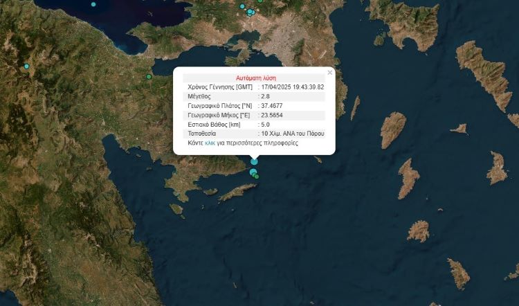 Τρία λεπτά αργότερα ακολούθησε σεισμική δόνηση 3,2 Ρίχτερ με εστιακό βάθος τα 5 χιλιόμετρα και επίκεντρο ανατολικά του Πόρου, σύμφωνα με την αυτόματη λύση του Γεωδυναμικού.
