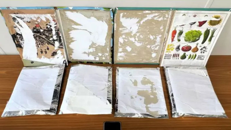 Κατά τον έλεγχο της χειραποσκευής του, βρέθηκαν δύο παιδικά βιβλία, των οποίων τα εξώφυλλα είχαν διαμορφωθεί ειδικά ώστε να κρύβουν τις ναρκωτικές ουσίες. Στον κρυφό χώρο ήταν τοποθετημένες τέσσερις νάιλον συσκευασίες με κοκαΐνη συνολικού μικτού βάρους 2.761 γραμμαρίων.