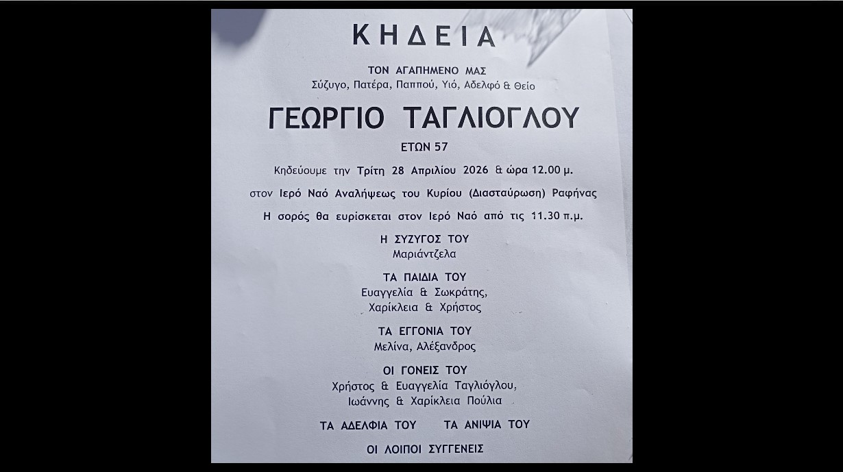 Τον αγαπημένο τους Γιώργο θα αποχαιρετήσουν οι γονείς του, η σύζυγός του, τα παιδιά του και τα εγγόνια του, σε μια στιγμή βαθιάς οδύνης που δύσκολα χωρά σε λέξεις. Γιατί όταν φεύγει ένας άνθρωπος τόσο νωρίς, δεν φεύγει μόνο ο ίδιος — φεύγουν μαζί του στιγμές, σχέδια και ένα κομμάτι από την καθημερινότητα όσων τον αγαπούσαν..
