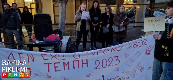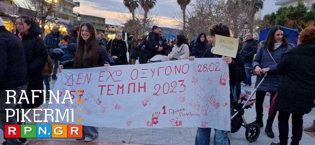 Στην κεντρική πλατεία της Ραφήνας πραγματοποιήθηκε συγκέντρωση συμπαράστασης στους συγγενείς των 57 θυμάτων του τραγικού δυστυχήματος στα Τέμπη. Η εκδήλωση διοργανώθηκε από την Ένωση Συλλόγων Γονέων και Κηδεμόνων μαθητών του δήμου Ραφήνας-Πικερμίου, με σύνθημα «Δεν έχω οξυγόνο».