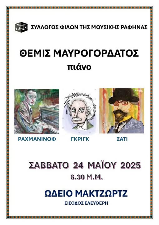 Ένα ξεχωριστό μουσικό γεγονός ετοιμάζεται να φιλοξενήσει η Ραφήνα, καθώς το Σάββατο 24 Μαΐου 2025, στις 8:30 το βράδυ, στην αίθουσα συναυλιών του Ωδείου Μακτζώρτζ (Ευβοϊκού 35), ο Σύλλογος Φίλων της Μουσικής Ραφήνας παρουσιάζει τον διακεκριμένο πιανίστα Θέμη Μαυρογορδάτο.