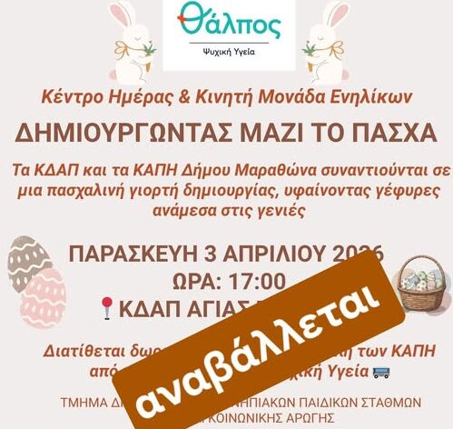 Η προγραμματισμένη διαγενεακή δράση δημιουργίας αναβάλλεται, καθώς τα ΚΔΑΠ του Δήμου Μαραθώνος δεν θα λειτουργήσουν σήμερα, Παρασκευή 3/4/2026.