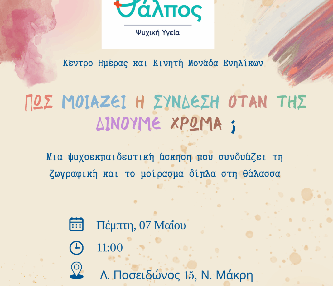 Το Κέντρο Ημέρας και η Κινητή Μονάδα Ενηλίκων «Θάλπος – Ψυχική Υγεία» διοργανώνουν δράση ψυχοκοινωνικής ενδυνάμωσης την Πέμπτη 7 Μαΐου και ώρα 11:00, στη παραλία της Νέας Μάκρης (μπροστά από το Κέντρο Ημέρας Ενηλίκων, Λ.Ποσειδώνος 15).