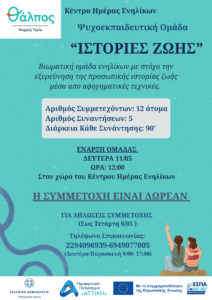 Το Κέντρο Ημέρας Ενηλίκων ΘΑΛΠΟΣ Ψυχική Υγεία με χαρά σας προσκαλεί στη νέα βιωματική ομάδα ενηλίκων με τίτλο: «Ιστορίες Ζωής».