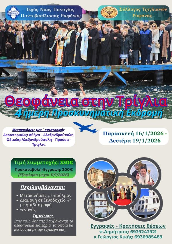 Η Ενορία μας, σε συνεργασία με τον Σύλλογο Τριγλιανών Ραφήνας, για μία ακόμη φορά διοργανώνουμε 4ήμερη προσκυνηματική εκδρομή στην Τρίγλια της Βιθυνίας, όπου θα έχουμε την ευλογία να εορτάσουμε την Δεσποτική Εορτή των Θεοφανείων, όπως έχει καθιερωθεί με το Παλαιό Ημερολόγιο, την Κυριακή 18 Ιανουαρίου 2026.