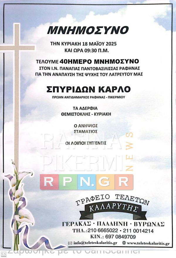 Το 40ήμερο μνημόσυνο του αείμνηστου Σπύρου Κάρλου, πρώην Αντιδημάρχου και εν ενεργεία Δημοτικού Συμβούλου του Δήμου Ραφήνας-Πικερμίου, θα τελεστεί την Κυριακή 18 Μαΐου 2025, στις 9:30 το πρωί, στον Ιερό Ναό Παναγίας Παντοβασίλισσας στη Ραφήνα.