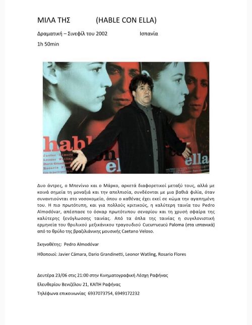 Με μια από τις σημαντικότερες ταινίες της σύγχρονης ευρωπαϊκής κινηματογραφίας, η Κινηματογραφική Λέσχη Ραφήνας ρίχνει αυλαία στο αφιέρωμα που ήταν αφιερωμένο στον πολυβραβευμένο Ισπανό σκηνοθέτη Pedro Almodóvar. Η ταινία “Μίλα της” (Hable con Ella), που θα προβληθεί τη Δευτέρα 23 Ιουνίου στις 21:00, στον εξώστη της Λέσχης,(ΚΑΠΗ Ραφήνας) αποτελεί μια συγκλονιστική κινηματογραφική εμπειρία και μία από τις πιο αγαπημένες δημιουργίες του Almodóvar.