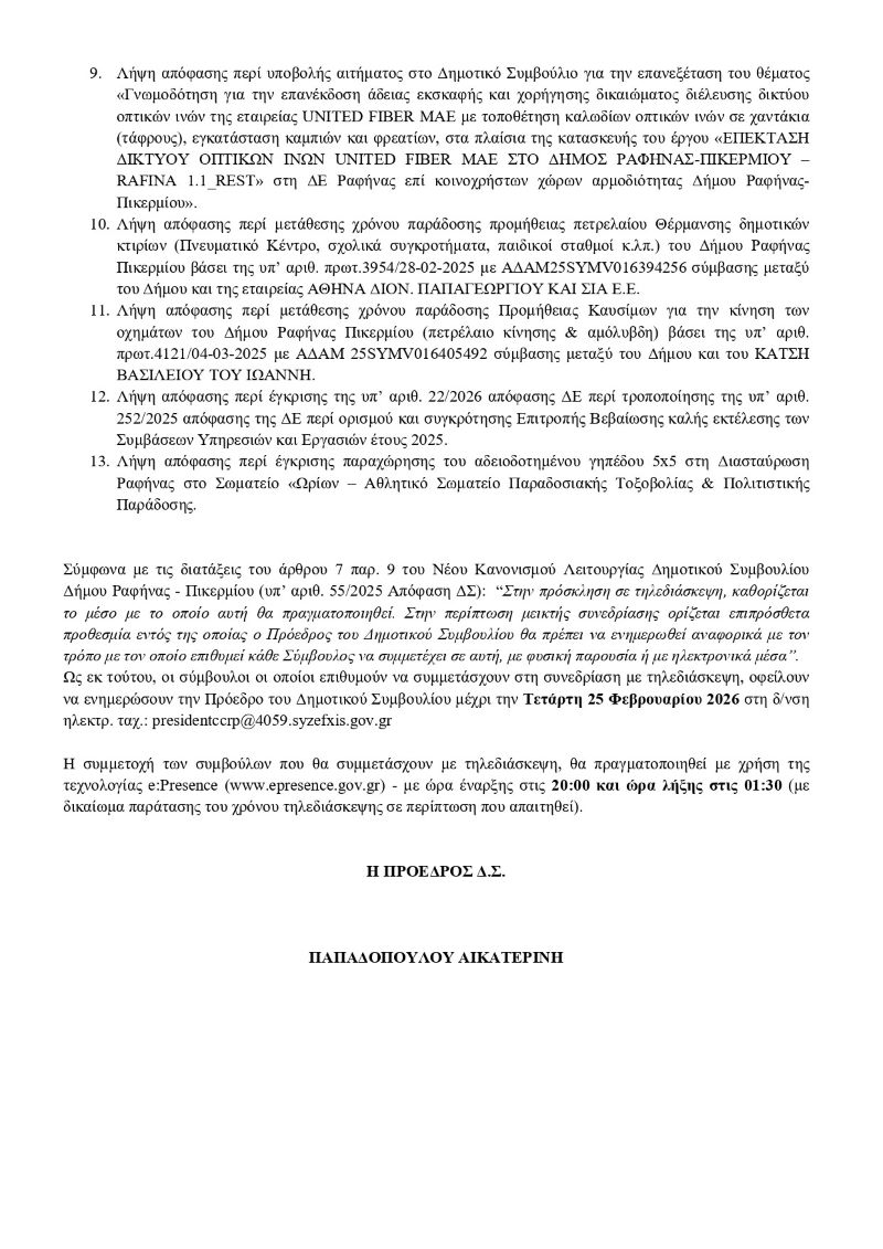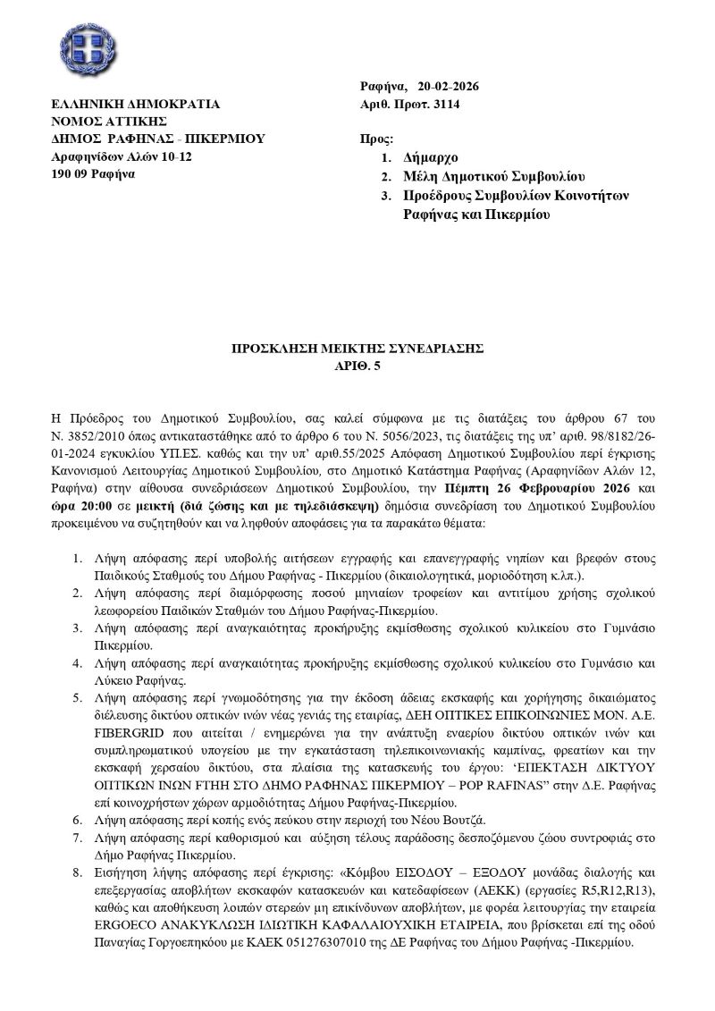ΔΗΜΟΤΙΚΟ ΣΥΜΒΟΥΛΙΟ ΡΑΦΗΝΑ - ΠΙΚΕΡΜΙΤΟΠΙΚΑ ΝΕΑΤΟΠΙΚΗ ΚΟΙΝΩΝΙΑ Λιγότερο από 1 λεπταΑνάγνωση Το Δημοτικό Συμβούλιο Ραφήνας Πικερμίου συνεδριάζει στις 26/2 για 13 θέματα 24 Φεβρουαρίου, 2026 FacebookTwitterPinterestWhatsApp ΠΡΟΣΚΛΗΣΗ ΜΕΙΚΤΗΣ ΣΥΝΕΔΡΙΑΣΗΣ ΑΡΙΘ. 5 Αυτή την εβδομάδα ΕΙΔΗΣΕΙΣ Τραγωδία στην Αμφιλοχία: Κατέληξε ο 80χρονος οδηγός έπειτα από σφοδρό τροχαίο 24 Φεβρουαρίου, 2026 0 Τραγική κατάληξη είχε το σοβαρό τροχαίο ατύχημα που σημειώθηκε... Life Style -Μόδα Ένοχος ο Κώστας Δόξας – Η ποινή που του επιβλήθηκε για την υπόθεση ενδοοικογενειακής βίας 24 Φεβρουαρίου, 2026 0 Χωρίς ελαφρυντικά κρίθηκε ένοχος ο Κώστας Δόξας για ενδοοικογενειακή... ΔΙΑΦΟΡΑ Ν.Δ. για ΟΠΕΚΕΠΕ: Δεν στοιχειοθετούνται ποινικές ευθύνες για τους πρώην Υπουργούς – Αναλυτικά τα πορίσματα 24 Φεβρουαρίου, 2026 0 Εκ διαμέτρου αντίθετα είναι τα πορίσματα της Νέας Δημοκρατίας... ΔΙΑΦΟΡΑ Έκτακτη είδηση – ΟΠΕΚΕΠΕ: Προκαταρκτική Επιτροπή για Βορίδη – Αυγενάκη απαιτούν Κόμματα της Αντιπολίτευση 24 Φεβρουαρίου, 2026 0 Βαρύτατες ευθύνες στους πρώην υπουργούς Αγροτικής Ανάπτυξης, Μάκη Βορίδη... ΜΑΡΑΘΩΝΑΣ - ΝΕΑ ΜΑΚΡΗ Νέα Μάκρη Θάλπος: «Γυναίκα: Η Σιωπηλή Φροντίστρια» 24 Φεβρουαρίου, 2026 0 Το Κέντρο Ημέρας και η Κινητή Μονάδα Ενηλίκων του... ΝΕΑ ΕΙΔΗΣΕΙΣ Τραγωδία στην Αμφιλοχία: Κατέληξε ο 80χρονος οδηγός έπειτα από σφοδρό τροχαίο 0 Τραγική κατάληξη είχε το σοβαρό τροχαίο ατύχημα που σημειώθηκε... Life Style -Μόδα Ένοχος ο Κώστας Δόξας – Η ποινή που του επιβλήθηκε για την υπόθεση ενδοοικογενειακής βίας 0 Χωρίς ελαφρυντικά κρίθηκε ένοχος ο Κώστας Δόξας για ενδοοικογενειακή... ΔΙΑΦΟΡΑ Ν.Δ. για ΟΠΕΚΕΠΕ: Δεν στοιχειοθετούνται ποινικές ευθύνες για τους πρώην Υπουργούς – Αναλυτικά τα πορίσματα 0 Εκ διαμέτρου αντίθετα είναι τα πορίσματα της Νέας Δημοκρατίας... ΔΙΑΦΟΡΑ Έκτακτη είδηση – ΟΠΕΚΕΠΕ: Προκαταρκτική Επιτροπή για Βορίδη – Αυγενάκη απαιτούν Κόμματα της Αντιπολίτευση 0 Βαρύτατες ευθύνες στους πρώην υπουργούς Αγροτικής Ανάπτυξης, Μάκη Βορίδη... ΜΑΡΑΘΩΝΑΣ - ΝΕΑ ΜΑΚΡΗ Νέα Μάκρη Θάλπος: «Γυναίκα: Η Σιωπηλή Φροντίστρια» 0 Το Κέντρο Ημέρας και η Κινητή Μονάδα Ενηλίκων του... ΕΙΔΗΣΕΙΣ «Αυτοί με μια σφαλιάρα φεύγουν»: Η Βούλτεψη συγκρίνει τους σημερινούς κομμουνιστές με τους «200» 0 Σφοδρές αντιδράσεις προκάλεσαν οι δηλώσεις της Σοφίας Βούλτεψη, η... ΑΘΛΗΤΙΚΑ Πέθανε ο παλαίμαχος ποδοσφαιριστής του Ολυμπιακού Σωτήρης Γκαβέζος: Η ανακοίνωση της ομάδας 0 Θλίψη στον κόσμο του ελληνικού ποδοσφαίρου προκάλεσε η είδηση... Life Style -Μόδα Μπράντ Πιτ: Μετά τα γυρίσματα στην Ύδρα πηγαίνει… Νέα Μάκρη- Τι αποκάλυψε ο δήμαρχος Στέργιος Τσίρκας 0 Μετά την Ύδρα, η διεθνής κινηματογραφική παραγωγή με τη... RPN.GR Νέα Μάκρη Θάλπος: «Γυναίκα: Η Σιωπηλή Φροντίστρια» ΜΑΡΑΘΩΝΑΣ - ΝΕΑ ΜΑΚΡΗ 24 Φεβρουαρίου, 2026 Μπράντ Πιτ: Μετά τα γυρίσματα στην Ύδρα πηγαίνει… Νέα Μάκρη- Τι αποκάλυψε ο δήμαρχος Στέργιος Τσίρκας Life Style -Μόδα 24 Φεβρουαρίου, 2026 O Εμπορικός Σύλλογος Ραφήνας Πικερμίου κόβει την βασιλόπιτα την Παρασκευή 27/2 ΕΚΔΗΛΩΣΕΙΣ 24 Φεβρουαρίου, 2026 Αδιαφορία του δήμου Ραφήνας Πικερμίου: Νεκρός σκύλος παραμένει σε κοινή θέα επί δύο ημέρες ΡΑΦΗΝΑ - ΠΙΚΕΡΜΙ 24 Φεβρουαρίου, 2026 Ο Α.Ο Τριγλίας Ραφήνας ζητά ισονομία, διαφάνεια και σεβασμό στους κανονισμούς του παιχνιδιού ΑΘΛΗΤΙΚΑ 24 Φεβρουαρίου, 2026 ΕΙΔΗΣΕΙΣΡΑΦΗΝΑ - ΠΙΚΕΡΜΙΑΘΛΗΤΙΚΑΜΑΡΑΘΩΝΑΣ - ΝΕΑ ΜΑΚΡΗΕΚΔΗΛΩΣΕΙΣΤΟΠΙΚΗ ΚΟΙΝΩΝΙΑΔΙΑΦΟΡΑ Προηγούμενο άρθροΝ.Δ. για ΟΠΕΚΕΠΕ: Δεν στοιχειοθετούνται ποινικές ευθύνες για τους πρώην Υπ