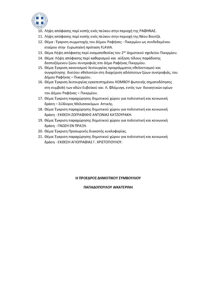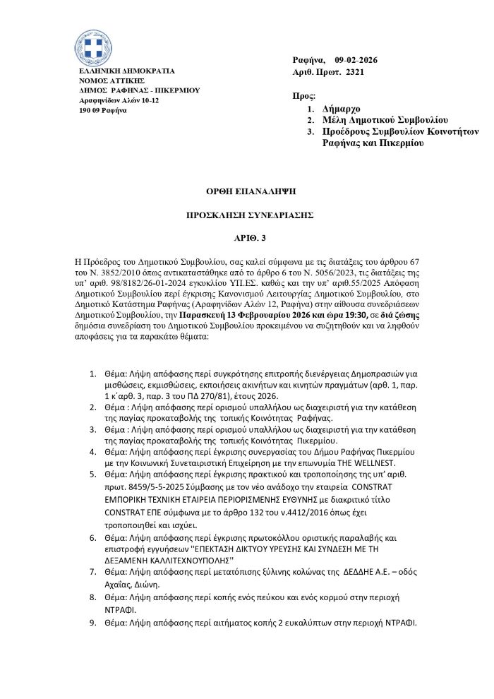 ΔΗΜΟΤΙΚΟ ΣΥΜΒΟΥΛΙΟ ΡΑΦΗΝΑ - ΠΙΚΕΡΜΙΤΟΠΙΚΑ ΝΕΑΤΟΠΙΚΗ ΚΟΙΝΩΝΙΑ Λιγότερο από 1 λεπταΑνάγνωση To Δημοτικό Συμβούλιο Ραφήνας Πικερμίου συνεδριάζει την Παρασκευή 13 Φεβρουαρίου για 21 θέματα 10 Φεβρουαρίου, 2026 FacebookTwitterPinterestWhatsApp Πρόσκληση Δημοτικού Συμβουλίου – Παρασκευή 13 Φεβρουαρίου TagsΔημοτικό συμβούλιο Ραφήνας Πικερμίου Αυτή την εβδομάδα ΡΑΦΗΝΑ - ΠΙΚΕΡΜΙ Χωρίς νερό το 3ο ΕΚ Ανατολικής Αττικής στη Ραφήνα – Διαμαρτυρίες μαθητών: «Μας έφεραν νερό σε κουβάδες, τι είμαστε;» 10 Φεβρουαρίου, 2026 0 Έντονες αντιδράσεις και εύλογη αγανάκτηση προκαλεί η κατάσταση που... ΤΟΠΙΚΗ ΑΓΟΡΑ Και νοστιμότατες κοτομπουκιές στο ΑΣΠΡΟ ΓΙΔΙ – Κεντρική Πλατεία Ραφήνας 10 Φεβρουαρίου, 2026 0 Θα ήταν... σοβαρή παράλειψη να μην απολαύσετε το πιάτο... ΔΙΑΦΟΡΑ Χειμερινοί Ολυμπιακοί Αγώνες με… ελαττωματικά μετάλλια! 10 Φεβρουαρίου, 2026 0 Αίσθηση προκαλεί δημοσίευμα της Wall Street Journal το οποίο... ΖΩΔΙΑ Τα ζώδια σήμερα 10/2 10 Φεβρουαρίου, 2026 0 Αναλυτικές προβλέψεις ημέρας για όλα τα ζώδια Κριός: Φίλε... ΚΑΙΡΟΣ Καιρός: Βροχές και καταιγίδες τουλάχιστον μέχρι την Παρασκευή – Οι προειδοποιήσεις των μετεωρολόγων 10 Φεβρουαρίου, 2026 0 Γενικά άστατος θα παρουσιαστεί ο καιρός σήμερα, Τρίτη 10... ΝΕΑ ΡΑΦΗΝΑ - ΠΙΚΕΡΜΙ Χωρίς νερό το 3ο ΕΚ Ανατολικής Αττικής στη Ραφήνα – Διαμαρτυρίες μαθητών: «Μας έφεραν νερό σε κουβάδες, τι είμαστε;» 0 Έντονες αντιδράσεις και εύλογη αγανάκτηση προκαλεί η κατάσταση που... ΤΟΠΙΚΗ ΑΓΟΡΑ Και νοστιμότατες κοτομπουκιές στο ΑΣΠΡΟ ΓΙΔΙ – Κεντρική Πλατεία Ραφήνας 0 Θα ήταν... σοβαρή παράλειψη να μην απολαύσετε το πιάτο... ΔΙΑΦΟΡΑ Χειμερινοί Ολυμπιακοί Αγώνες με… ελαττωματικά μετάλλια! 0 Αίσθηση προκαλεί δημοσίευμα της Wall Street Journal το οποίο... ΖΩΔΙΑ Τα ζώδια σήμερα 10/2 0 Αναλυτικές προβλέψεις ημέρας για όλα τα ζώδια Κριός: Φίλε... ΚΑΙΡΟΣ Καιρός: Βροχές και καταιγίδες τουλάχιστον μέχρι την Παρασκευή – Οι προειδοποιήσεις των μετεωρολόγων 0 Γενικά άστατος θα παρουσιαστεί ο καιρός σήμερα, Τρίτη 10... ΕΙΔΗΣΕΙΣ Ελευσίνα: Η κόρη σκότωσε τη μητέρα της με το αυτοκίνητο μπροστά στα μάτια των εγγονιών της 0 Σοκ και βαθιά θλίψη επικρατούν στην Ελευσίνα μετά το... ΑΘΛΗΤΙΚΑ Ο Αθλητικός Σύλλογος Νέου Βουτζά “Η ΠΡΟΟΔΟΣ” στο Μητρώο Πολιτιστικών Φορέων του Υπουργείου Πολιτισμού 0 Με ιδιαίτερη υπερηφάνεια και μεγάλη χαρά ανακοινώνουμε ότι ο Αθλητικός... ΔΙΑΦΟΡΑ Άγιος Χαράλαμπος ο Ιερομάρτυρας και τα φρικτά βασανιστήρια 0 Τη μνήμη του Αγίου Χαραλάμπους τιμά σήμερα, 10 Φεβρουαρίου, η Εκκλησία μας.... RPN.GR Χωρίς νερό το 3ο ΕΚ Ανατολικής Αττικής στη Ραφήνα – Διαμαρτυρίες μαθητών: «Μας έφεραν νερό σε κουβάδες, τι είμαστε;» ΡΑΦΗΝΑ - ΠΙΚΕΡΜΙ 10 Φεβρουαρίου, 2026 Και νοστιμότατες κοτομπουκιές στο ΑΣΠΡΟ ΓΙΔΙ – Κεντρική Πλατεία Ραφήνας ΤΟΠΙΚΗ ΑΓΟΡΑ 10 Φεβρουαρίου, 2026 Ο Αθλητικός Σύλλογος Νέου Βουτζά “Η ΠΡΟΟΔΟΣ” στο Μητρώο Πολιτιστικών Φορέων του Υπουργείου Πολιτισμού ΑΘΛΗΤΙΚΑ 10 Φεβρουαρίου, 2026 1ο Γυμνάσιο Ραφήνας: Αθλητισμός και πρωταθλητισμός- Δρόμοι ζωής για τα παιδιά μας ΡΑΦΗΝΑ - ΠΙΚΕΡΜΙ 10 Φεβρουαρίου, 2026 Συνάντηση χειμερινών κολυμβητών από το Μπλε Λιμανάκι ΜΑΡΑΘΩΝΑΣ - ΝΕΑ ΜΑΚΡΗ 9 Φεβρουαρίου, 2026 ΕΙΔΗΣΕΙΣΡΑΦΗΝΑ - ΠΙΚΕΡΜΙΑΘΛΗΤΙΚΑΜΑΡΑΘΩΝΑΣ - ΝΕΑ ΜΑΚΡΗΕΚΔΗΛΩΣΕΙΣΤΟΠΙΚΗ ΚΟΙΝΩΝΙΑΔΙΑΦΟΡΑ Προηγούμενο άρθροΚαιρός: Βροχές και καταιγίδες τουλάχιστον μέχρι την Παρασκευή – Οι προειδοποιήσεις των μετεωρολόγωνΕπόμενο άρθροΤα ζώδια σήμερα 10/2