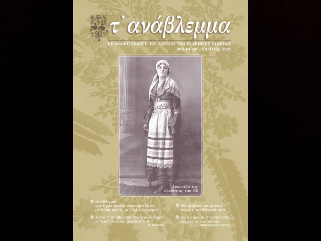 Γεμάτο ντοκουμέντα, αφηγήσεις, λαογραφικές προσεγγίσεις κυκλοφόρησε το νέο τεύχος του περιοδικού Τ΄Ανάβλεμμα. Αποχαιρετούμε με θλίψη τη Ρένα Φούντη, μέλος του Δ.Σ., που έφυγε απρόσμενα από τη ζωή.Με την αφήγησή της, Λυκειάδα του ’30 μάς παραπέμπει στους Ολυμπιακούς Αγώνες της εποχής της, το ελληνικό Κοιμητήριο στη Σερβία θυμίζει ένδοξες εποχές και αποδίδει φόρο τιμής σε Έλληνες ήρωες. Η συνάντηση με τον Γρηγόρη Λαμπράκη στους αγώνες της Κωνσταντινούπολης είναι μια σπάνια μαρτυρία , ενώ το όνομα της προσφυγικής πατρίδας της Ραφήνας, της Τρίγλιας, στο “μπλοκ 15” του στρατοπέδου Χαϊδαρίου είναι μια αποκάλυψη για την ιστορία του τόπου μας.Τα Πασχαλόγιορτα είναι επίκαιρα και γιορταστικά.