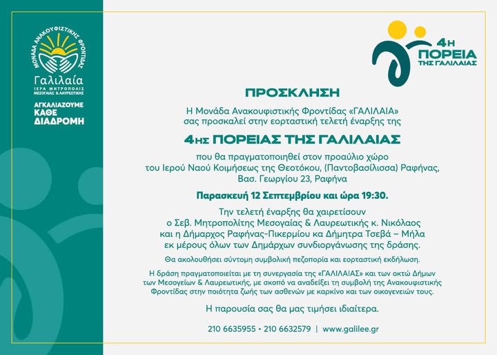Για τέταρτη συνεχή χρονιά, η Πρότυπη Μονάδα Ανακουφιστικής Φροντίδας «Γαλιλαία» διοργανώνει την εμβληματική «Πορεία της Γαλιλαίας», έναν θεσμό ευαισθητοποίησης και συμπαράστασης προς τους ασθενείς που δίνουν τη μάχη με τον καρκίνο. Η φετινή εκδήλωση θα πραγματοποιηθεί την Παρασκευή 12 Σεπτεμβρίου 2025 στη Ραφήνα.