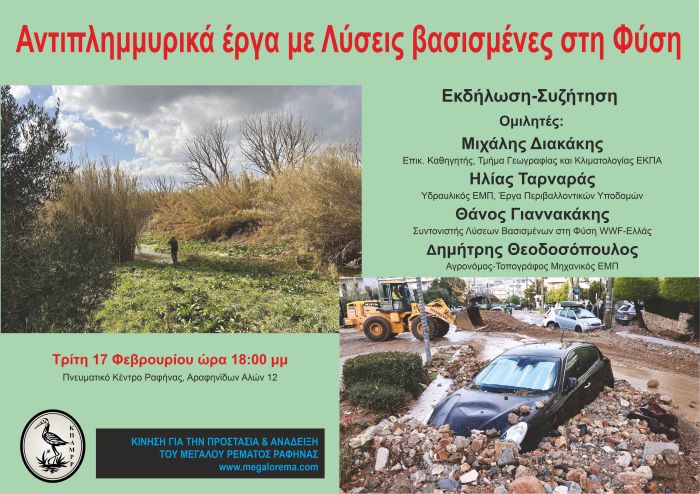 Σας καλούμε την Τρίτη 17/2/2026 18:00 στο Πνευματικό Κέντρο Ραφήνας (Αραφηνιδών Αλών 12) σε εκδήλωση-συζήτηση με το θέμα «Αντιπλημμυρικά έργα με Λύσεις βασισμένες στη Φύση» με ομιλητές τους: