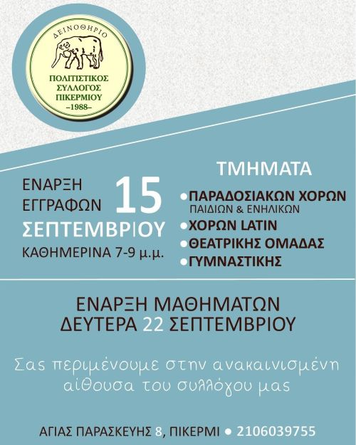 Από Δευτέρα 15 Σεπτεμβρίου, καθημερινά 19:00–21:00, σας περιμένουμε στην ολοκαίνουργια αίθουσά μας, Αγίας Παρασκευής 8 στο Πικέρμι, για να γνωριστούμε από κοντά και να σας πούμε τα πάντα για τα φετινά τμήματα.