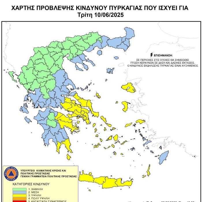 Σύμφωνα με το Χάρτη Πρόβλεψης Κινδύνου Πυρκαγιάς για σήμερα ΤΡΙΤΗ 10 ΙΟΥΝΙΟΥ 2025, προβλέπεται υψηλός κίνδυνος πυρκαγιάς (κατηγορία κινδύνου 3) στην Ανατολική Αττική και η πιθανότητα εκδήλωσης και στη συνέχεια ανάπτυξης πυρκαγιάς θεωρείται ΥΨΗΛΗ.